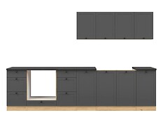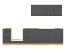 Rohová zostava Junona Line 240x220 obsahuje priestrannú spodnú časť, ktorá ponúka všetko potrebné: praktické skrinky s dvierkami, priestrannú drezovú skrinku, priestor na rúru a funkčnú sadu troch zásuviek na kuchynské doplnky.