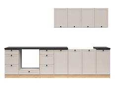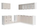 unkčnosť kuchynskej linky Junona Line dopĺňa estetický vzhľad a moderný, nadčasový dizajn. Korpusy v bielej farbe sú doplnené dvierkami v elegantnom prevedení uni kashmir s ozdobným rámom. Harmonický vzhľad dokresľujú jednoduché čierne úchytky.