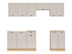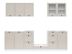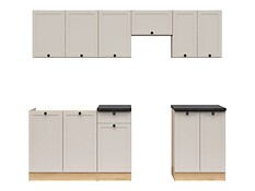 unkčnosť kuchynskej linky Junona Line dopĺňa estetický vzhľad a moderný, nadčasový dizajn. Korpusy v bielej farbe sú doplnené dvierkami v elegantnom prevedení uni kashmir s ozdobným rámom. Harmonický vzhľad dokresľujú jednoduché čierne úchytky.