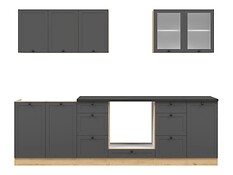 Rohová zostava Junona Line 240x220 obsahuje priestrannú spodnú časť, ktorá ponúka všetko potrebné: praktické skrinky s dvierkami, priestrannú drezovú skrinku, priestor na rúru a funkčnú sadu troch zásuviek na kuchynské doplnky.
