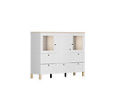 • Komoda obsahuje 4 zásuvky na valčekových koľajničkách a 8 políc ukrytých za dvoma dvierkami.
